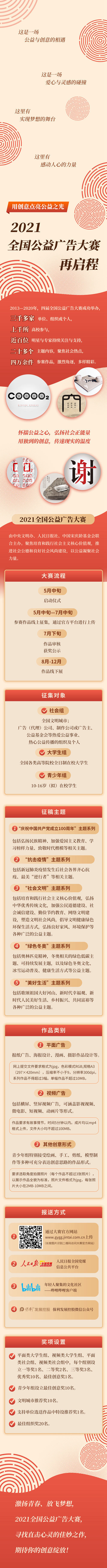 据了解,大赛投稿截止时间为2021年7月20号,参赛者可通过大赛官方网站(gygg.jintai.com.cn)、人民日报全国党媒信息公共平台、哔哩哔哩客户端、保利发展控股微信公众号了解大赛细则并投稿参赛。本届大赛将继续秉承公平、公正、公开的原则,对征集作品进行权威评审,挖掘优秀公益广告精品,发现公益广告人才,繁荣中国公益传播事业。